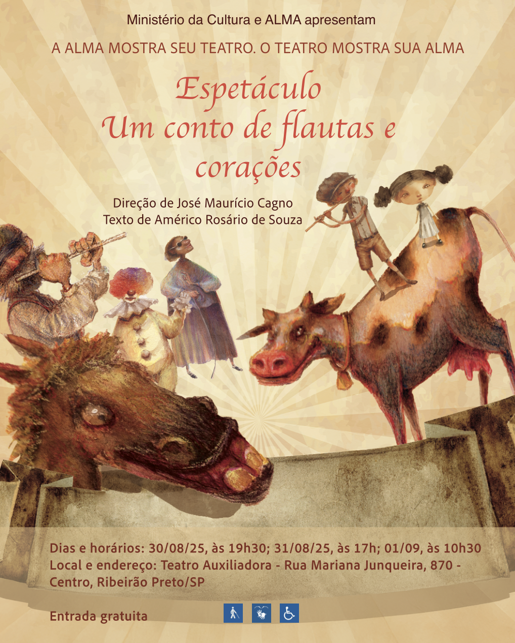 Ribeirão Preto (SP), 28 de agosto de 2025 – A Academia Livre de Música e Artes (Alma) comemora em 2025 uma década de atividades do seu Núcleo de Teatro. Para marcar a data, será realizada a Mostra de Teatro da Alma, que leva ao palco do Teatro Auxiliadora (Rua Mariana Junqueira, 870), em Ribeirão Preto, três montagens entre os meses de agosto e setembro. O primeiro espetáculo acontece neste sábado (30/8) e domingo (31/8). A entrada é gratuita e os ingressos podem ser retirados no local, meia hora antes do espetáculo.